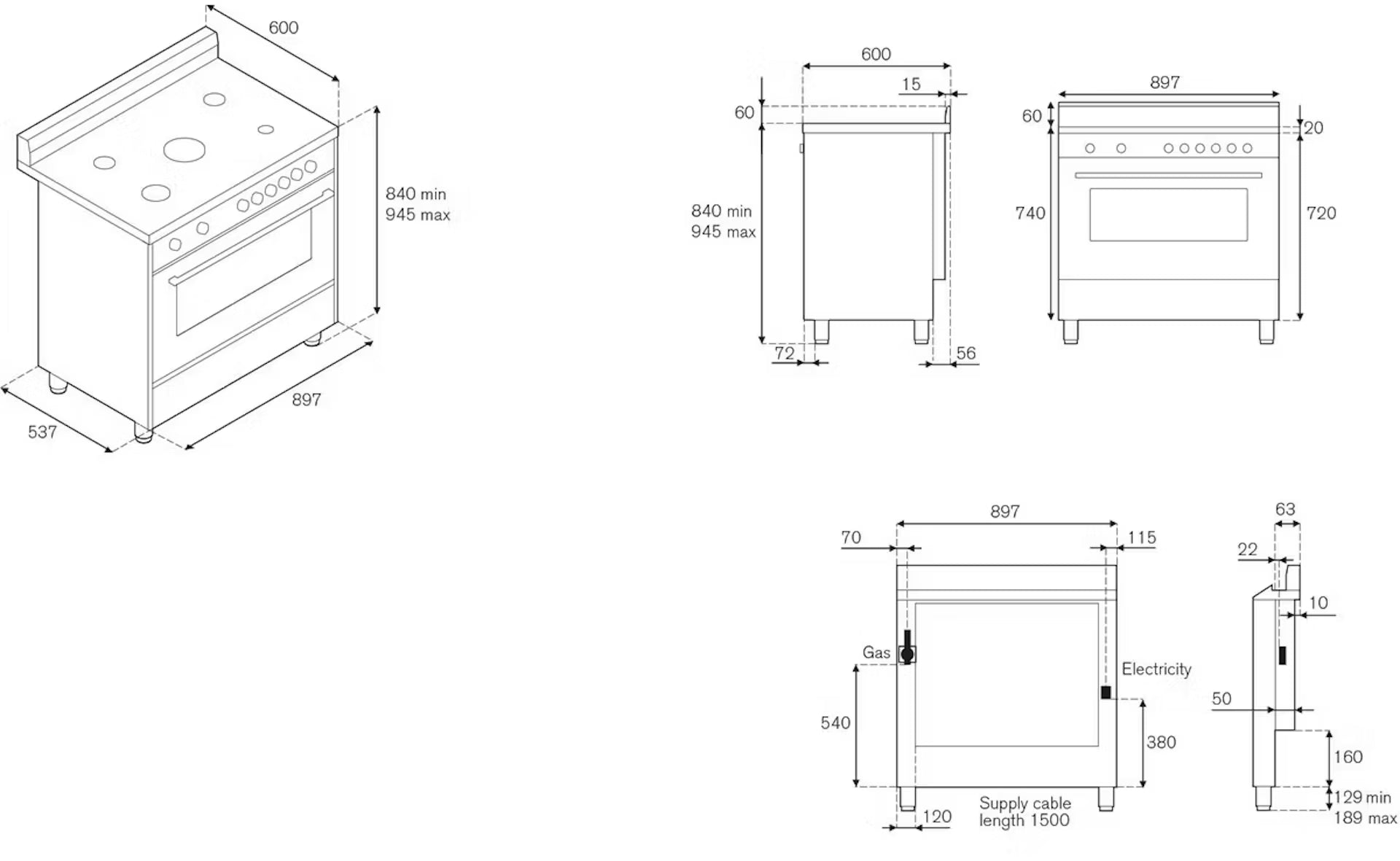 Vrijstaand fornuis met 5 gasbranders waaronder wok links, gietijzeren pandragers, éénknopsontsteking, 1 prime line multifunctionele oven, inhoud 117 liter, 11 functies, knopbediening.