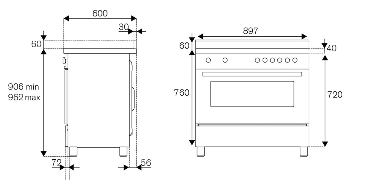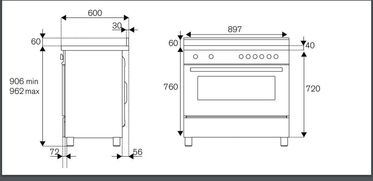 Vrijstaand inductie fornuis met 5 inductiezones, knop bediening, 1 oven met 11 functies, inhoud 117 liter, 1 standaard draadroosters, 1 braadslede met draadrooster en draaiknoppen inclusief kookwekker