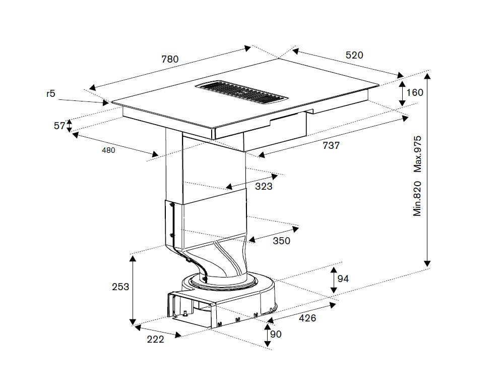 Inductiekookplat met afzuigsysteem, 4 zones met booster, tiptoets bediening, 9 vermogenstanden, 2 flexi zones, timer, restwarmte indicator, pan detectie, kinderslot, afzuigsysteem: 4 standen + 2 intensief, capaciteit 720 m3/h, timer, geluidsniveau 48/66 dB